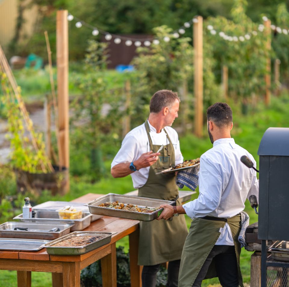 Food is central to every event. Menus are led by seasonal British produce, much of it grown on the farm itself, and range from relaxed feasting and barbecues to private dining and bespoke banqueting. Drinks flow from independent suppliers, with wine tastings, cocktail making and informal terrace gatherings adding to the experience.ย